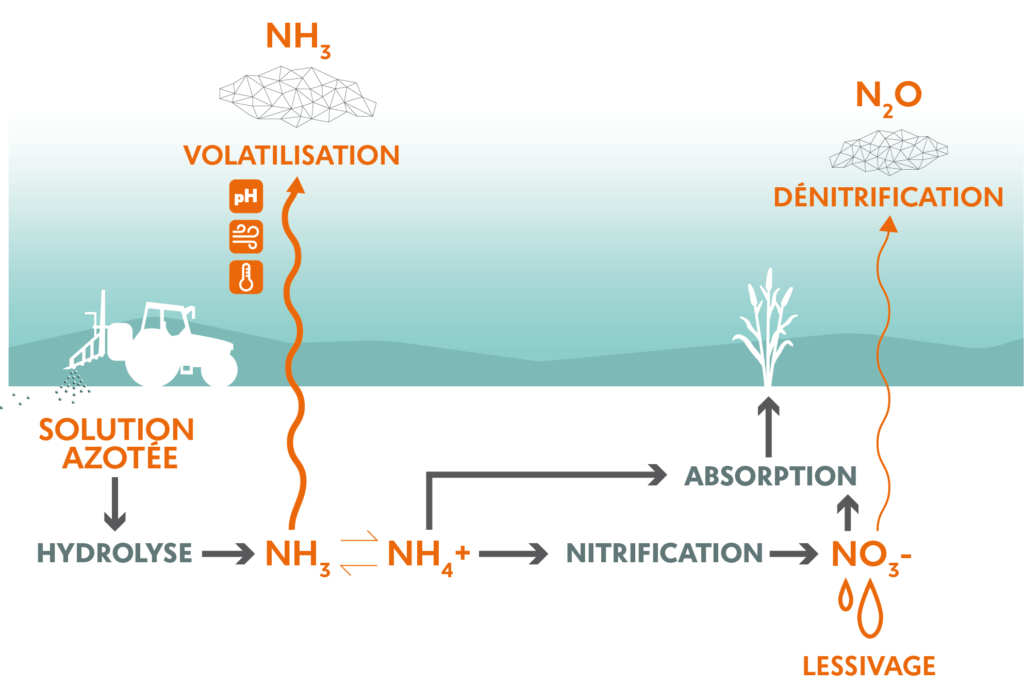 Ces pertes dont d’autant plus importantes sur les sols neutres à alcalins, pauvres en matière organique et lorsque les bonnes conditions climatiques lors de l’application ne sont pas réunies : température élevée, faible pluviométrie et vent fort.